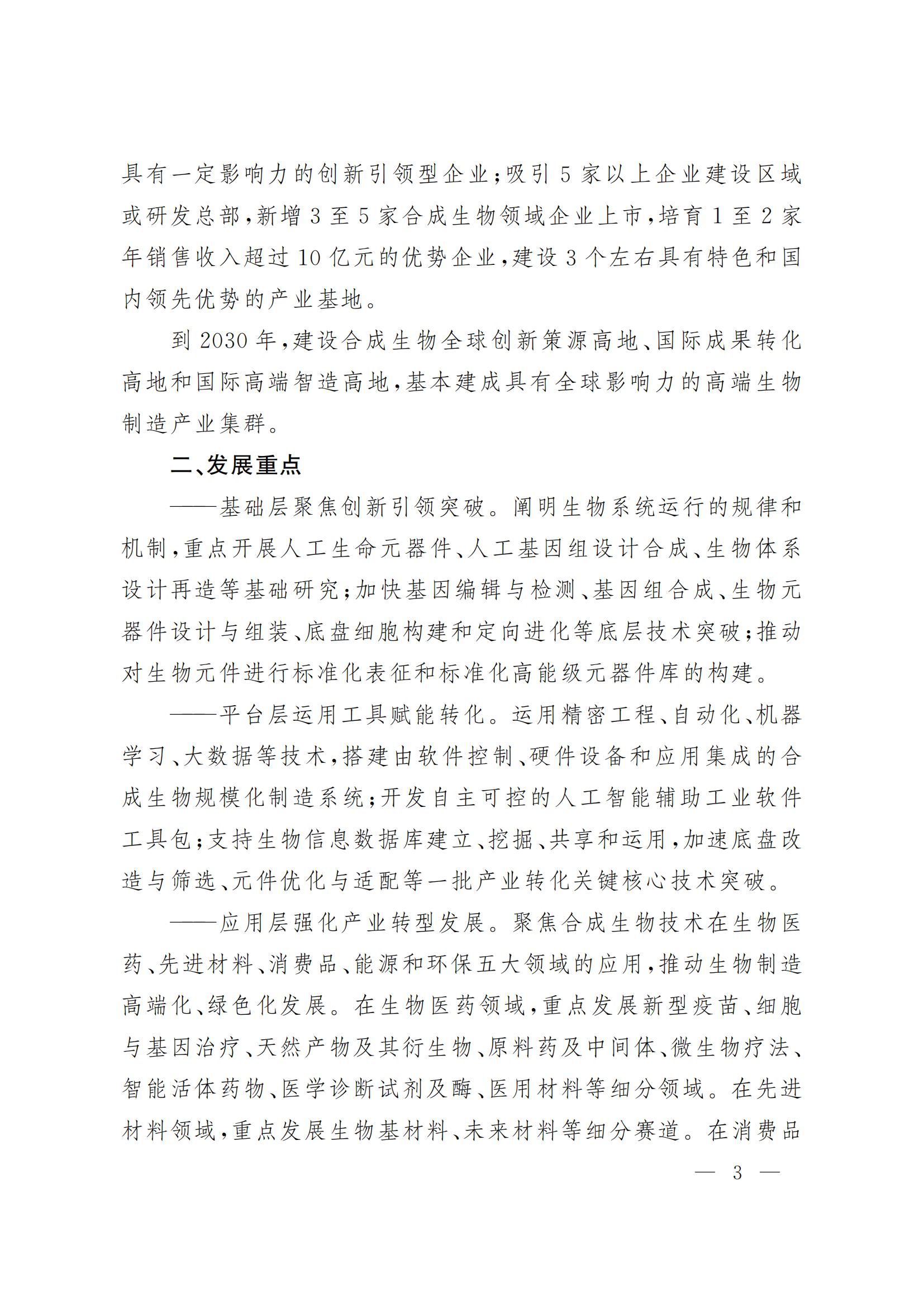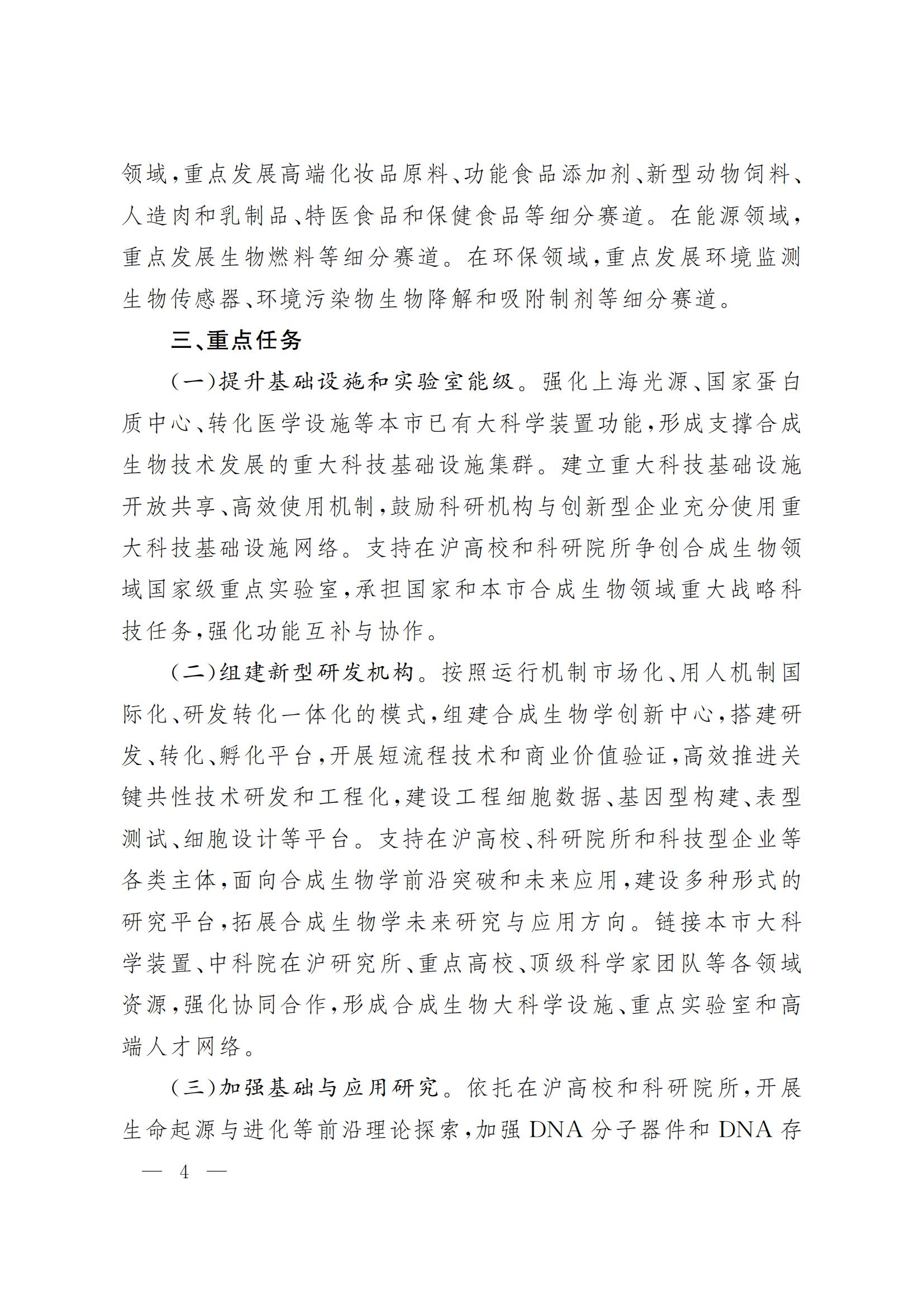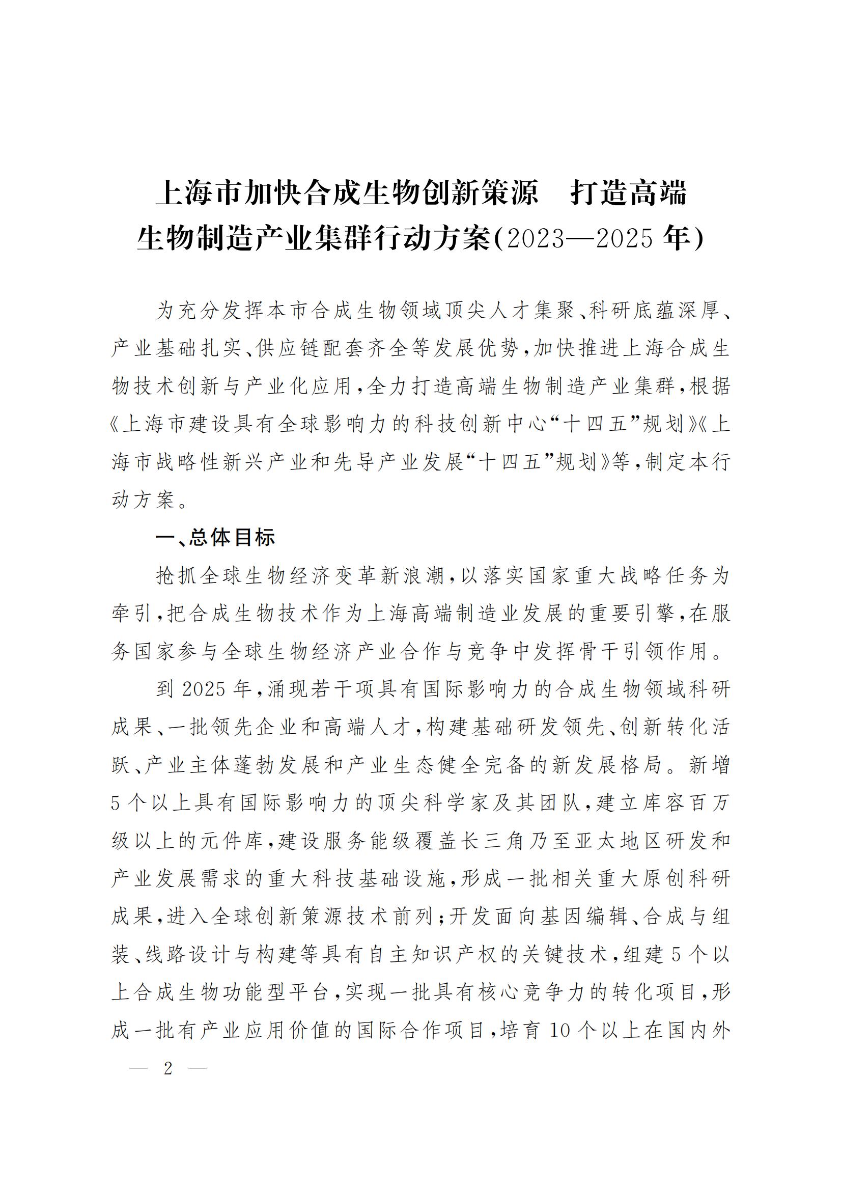 近日,上海市人民政府辦公廳印發《上海市加快合成生物創新策源 打造高端生物制造產業集群行動方案(2023-2025年)》,方案指出,到 2025 年,新增 5 個以上具有國際影響力的頂尖科學家及其團隊,建立庫容百萬級以上的元件庫,建設服務能級覆蓋長三角乃至亞太地區研發和產業發展需求的重大科技基礎設施,形成一批相關重大原創科研成果,進入全球創新策源技術前列。