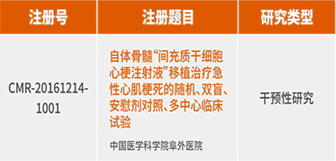2016 年年底,在我國醫(yī)學(xué)研究備案登記信息系統(tǒng)中,干細(xì)胞臨床研究項目《自體骨髓“間充質(zhì)干細(xì)胞心梗注射液”移植治療急性心肌梗死的隨機、雙盲、安慰劑對照、多中心臨床試驗》獲得國家備案,得到了國家干細(xì)胞臨床研究專家委員會的集體認(rèn)可。
